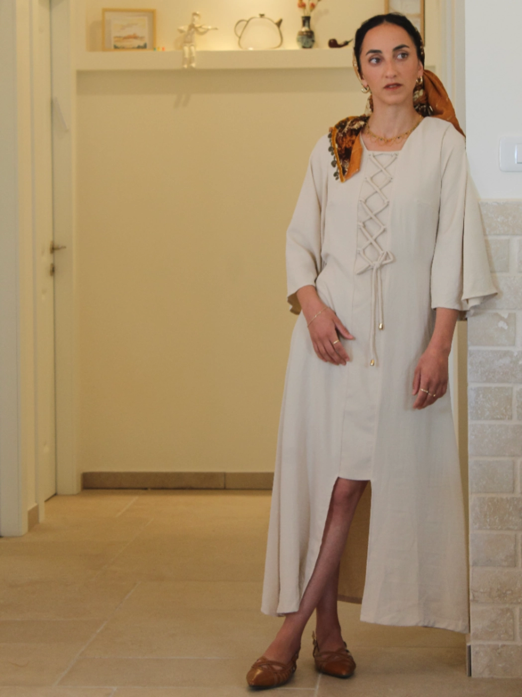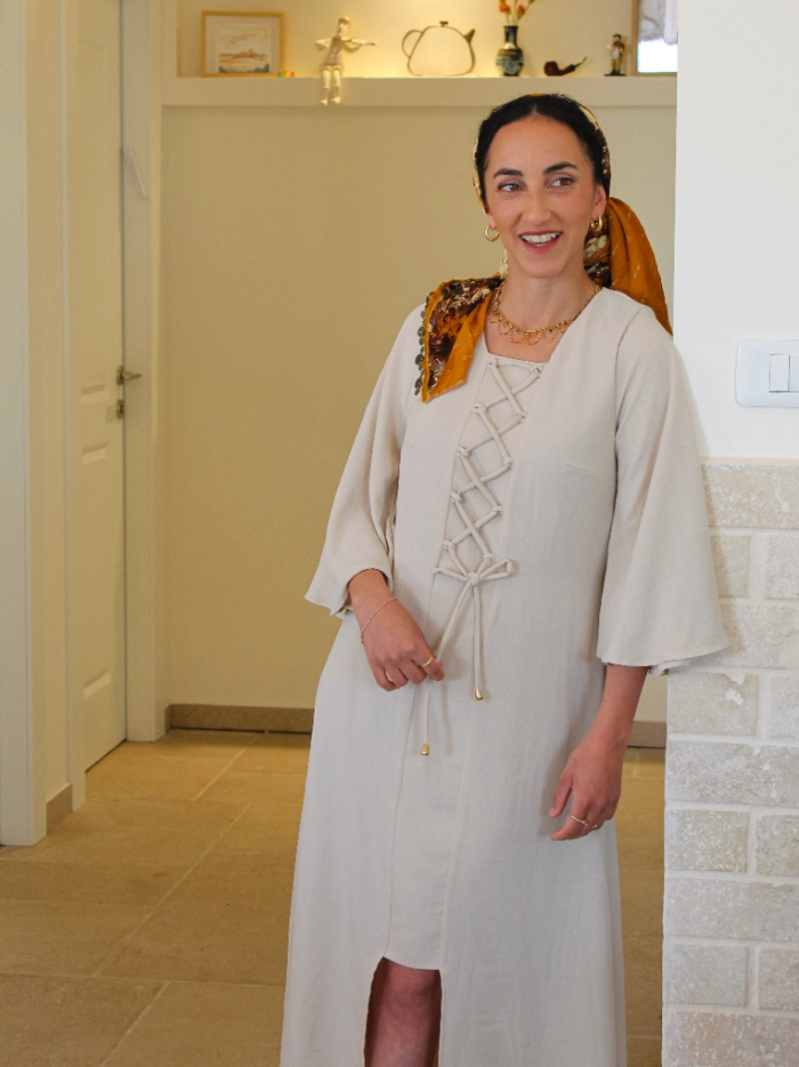 זאת שמלת הג'לביה שתמיד רציתי, בגלל שתמיד הייתי קטנטונת ביחס למידות בשוק כל הבגדים היו גדולים עליי מידי . לי הייתה חסרה בארון שמלת ג'לביה נשפכת שלא צריכה המון מאמץ כדי ללבוש אותה , ולכן יצרתי את שמלת שירת, שמלה מבד דמוי פשתן קלילה ונושמת כן למרות שהיא רק דמוי ושמעו את השוק היא גם פחות מתקמטת בכביסה מפשתן אמיתי, והאמת שאחרי ניסויי הכביסה שעשיתי עליה, לא הייתי צריכה בכלל לגהץ אותה!